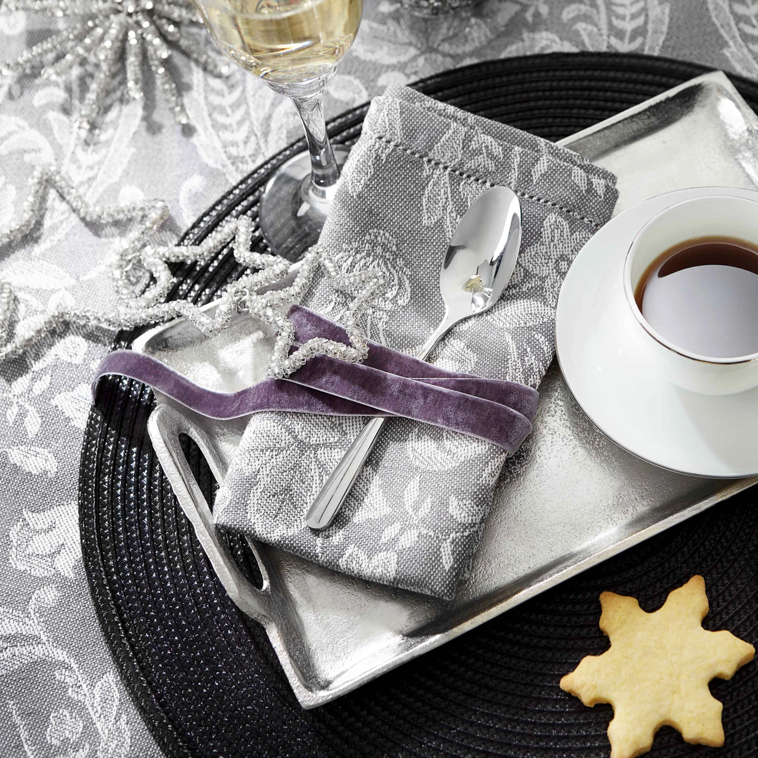 Auf festliche Inszenierungen versteht sich das silberne Banquet Metall-Tablett mit seiner klassischen, rechteckigen Form: Sie platzieren darauf z. B. die Gläser für den Sektempfang oder halten Zuckerdose, Milchkännchen und Gebäckteller für den Kaffee nach dem Essen bereit.