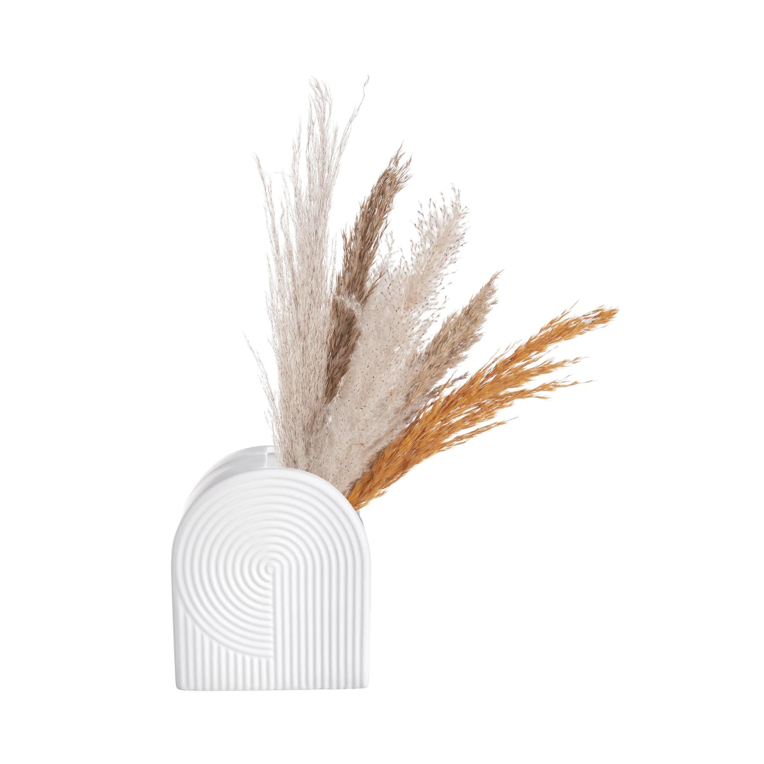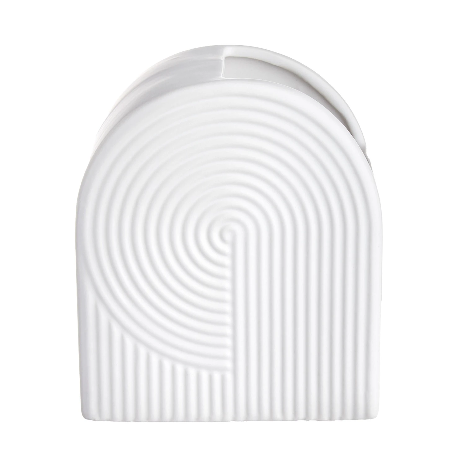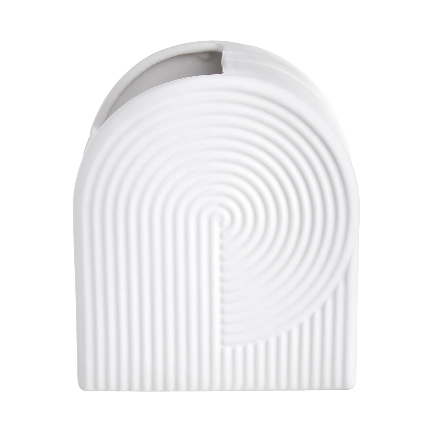 Mit ihren schönen Kurven macht die moderne Curve Vase aus weißem Steingut alle DesignliebhaberInnen schwach. Die Form der kompakten Vase wird vom Rillen-Dekor noch unterstrichen, und die Öffnung ist seitlich versetzt. So wird auch in Kombination mit einzelnen Blumen, Zweigen oder Trockensträußen ein raffinierter Effekt mit Kurvenlage erzielt.