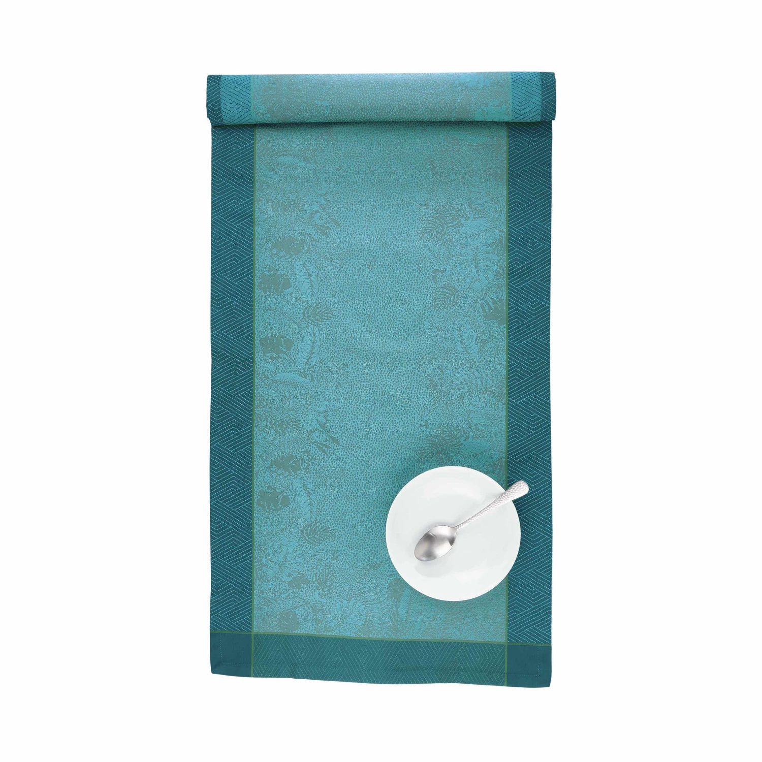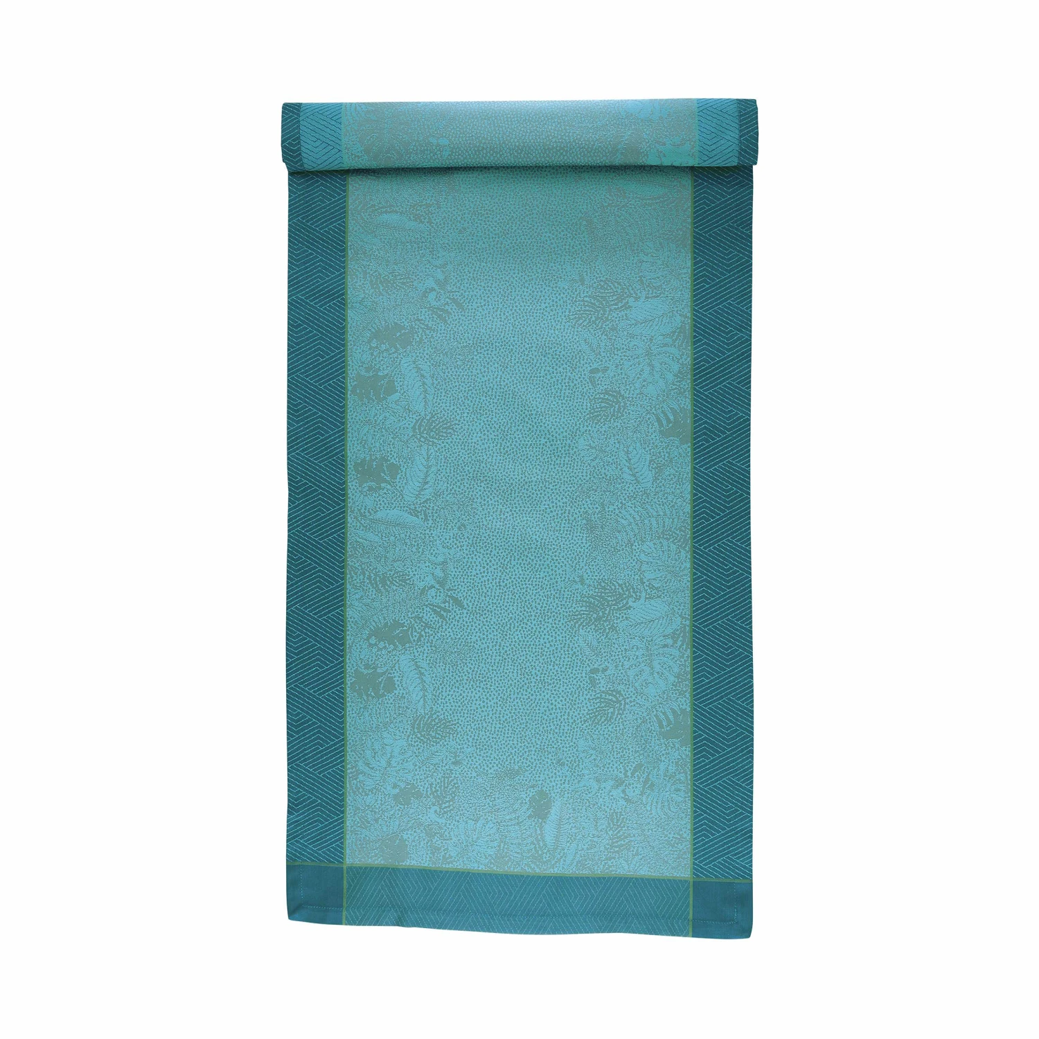 Der Green House Tischläufer aus gekämmter Baumwolle wurde in Jacquardmusterung gewebt und in der Farbe Petrol garngefärbt. Die exotischen Blätter infizieren Sie mit dem großen Dschungel-Fieber, das gerade bei allen Deko-Profis, Fashionistas und Interior-Stylisten um sich greift. Die Serie ist made in Portugal. Passende Tischdecken und Stoffservietten erhältlich.