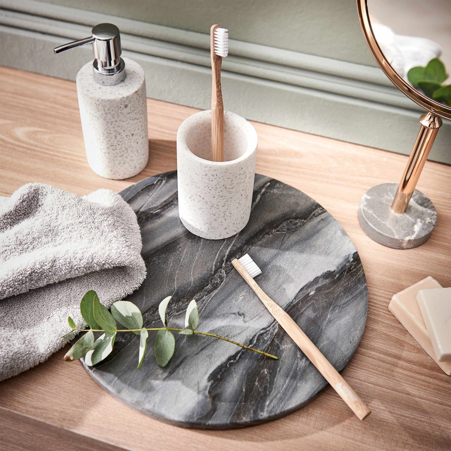 Mal was neues: Badutensilien in Terrazzooptik. Den Auftakt macht unter anderem der Samos Zahnputzbecher in Weiß. Die klassische Zylinderform des Bechers gepaart mit Terrazzo-Muster verleiht Ihrem Bad einen mediterranen Touch. Als Halterung für Ihre Zahnbürste und Zahnpasta ist der Zahnputzbecher ein nützliches Accessoire, das immer für Ordnung im Bad sorgt. Um das Bild komplett zu machen sind auch passende Seifenspender und -schale in Terrazzooptik bei uns erhältlich.